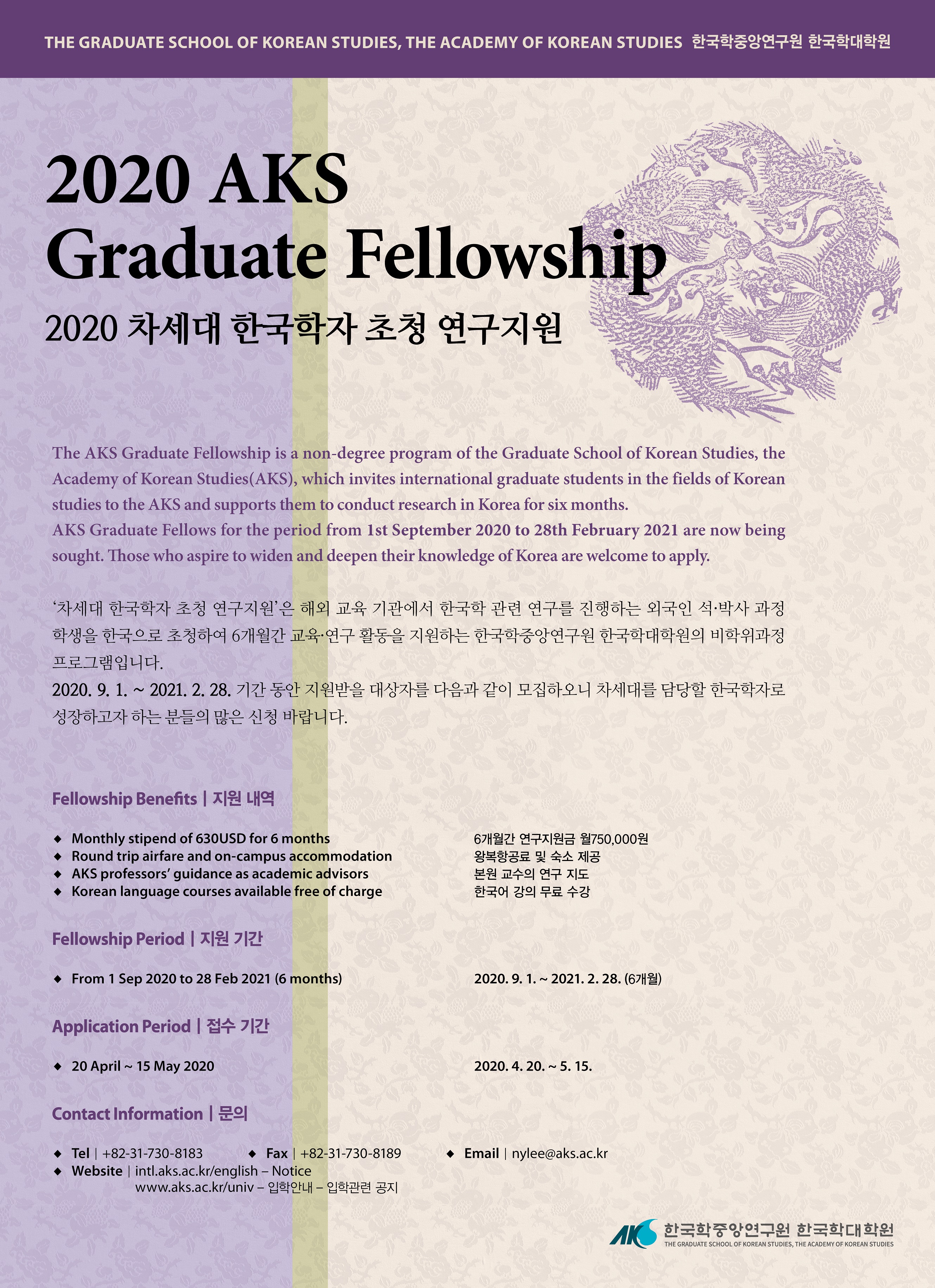 한국학중앙연구원 한국학대학원에서는 2020년도 후기 외국인 및 재외국민 신입생을 다음과 같이 모집합니다. 한국학 분야 석사 및 박사과정에 관심있는 학생들의 많은 지원 바랍니다. 구분 전형일정 비고 온라인 입학지원서 접수 2020. 3. 9.(월) 10:00 ~ 4. 3.(금) 17:00 gradaks.recruiter.co.kr 서류 및 전형료 접수 3. 9.(월) 10:00 ~ 4. 10.(금) 17:00 한국어 전화면접 4. 27.(월) ~ 4. 29